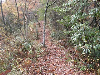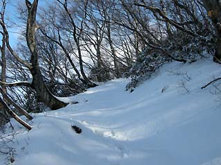 山道には枯れ葉が積もり、滑りやすい。600mを越えると積雪が10センチほどあり