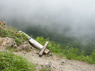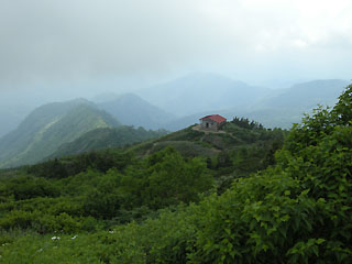 | 8:42 今年新しくなった甚之助避難小屋を通り過ぎ、旧小屋で休む。 |
