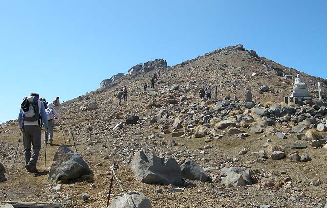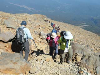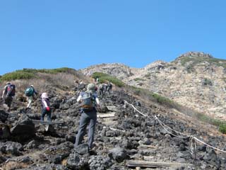 8合目までは木の階段が続くが、さらに9合目を目指すと火山岩のガレ場となり、登りがどんどんと急になる。