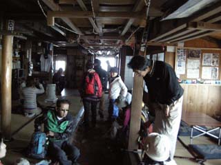 8:21 黒沢口七合目小屋。名物の小屋の真ん中を通る。