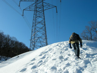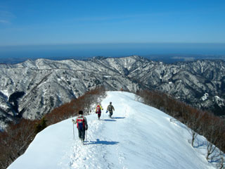 11:10 頂上 方位盤は雪の下、遠くに白山連峰