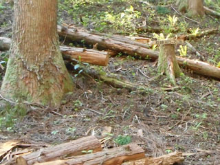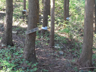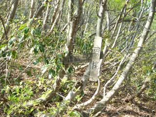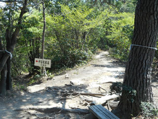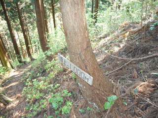 8:13 山側の木の根っこに、シャクナゲコースの看板が