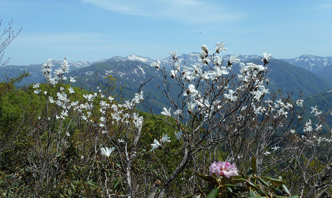 10:34 タムシバもきれいです(バックは笈ヶ岳方面)